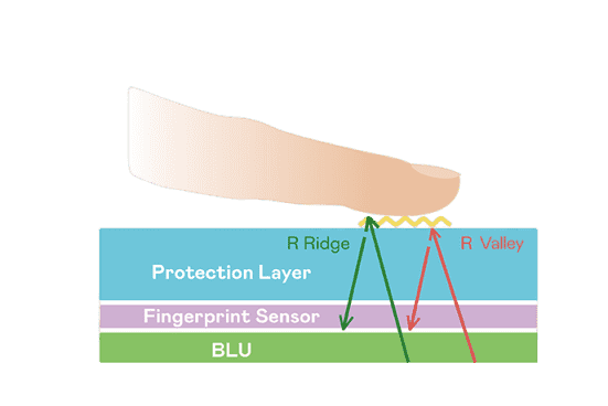 TFT 指纹扫描感测技术利用薄膜电晶体 (TFT) 当作光感测元件,,,藉由非晶硅 (a-Si) 与低温多晶硅(LTPS)既有光电转换特性对不同波段光源进行吸收,,使感测 IC 读取阵列感测元件的光漏电差异,,,转换成数位灰阶影像。。